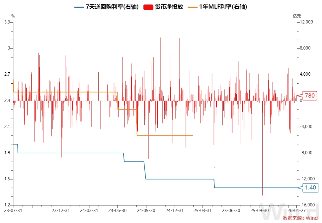 央行公告称,1月27日以固定利率、数量招标方式开展了4020亿元7天期逆回购操作,操作利率1.40%,投标量4020亿元,中标量4020亿元。Wind数据显示,当日3240亿元逆回购到期,据此计算,单日净投放780亿元。