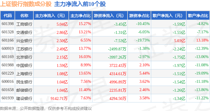 资金流向方面,上证银行(000134)指数成份股当日主力资金净流入合计16.63亿元,游资资金净流出合计9.65亿元,散户资金净流出合计6.98亿元。成份股资金流向详情见下表: