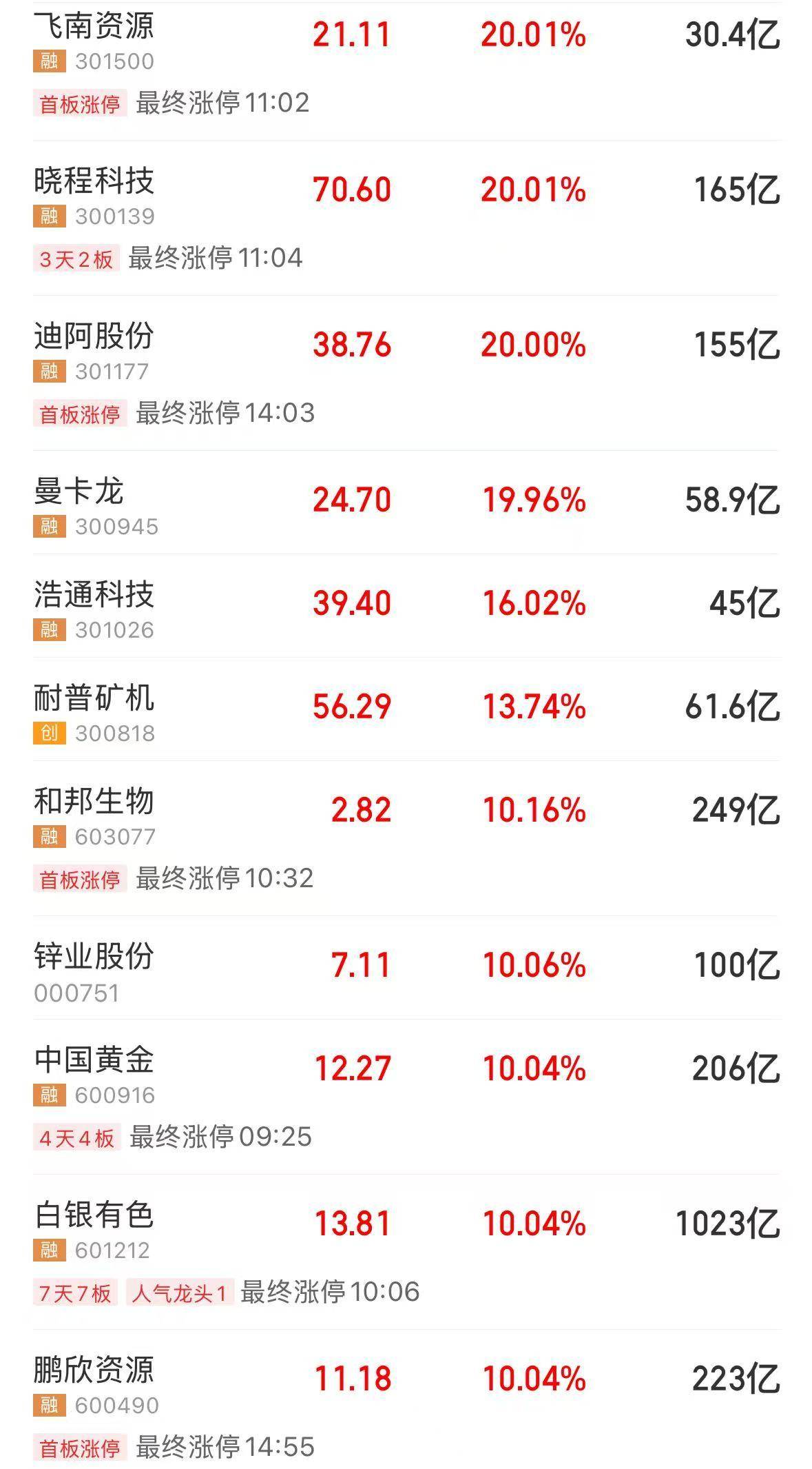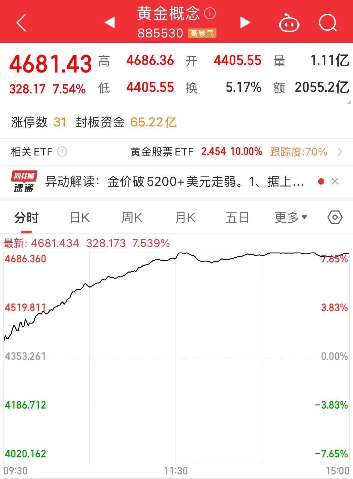 A股方面,黄金概念股今日大涨,中国黄金4连板,湖南黄金3连板,中曼石油、晓程科技3天2板,四川黄金10天6板,招金黄金8天5板。