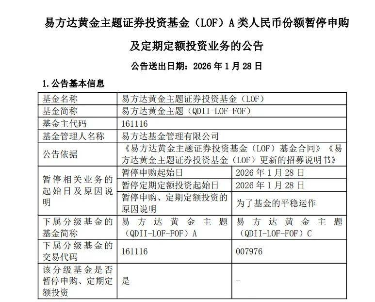 1月28日,黄金主题LOF(161116)公告,根据法律法规及基金法律文件的相关规定,易方达基金管理有限公司决定自2026年1月28日起暂停本基金A类人民币份额的申购及定期定额投资业务,赎回业务照常办理。本基金A类人民币份额恢复办理申购、定期定额投资业务的时间将另行公告。