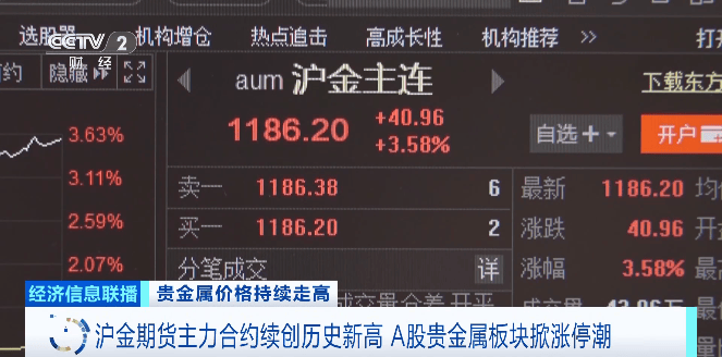 资本市场方面,A股贵金属板块持续走强,今年以来,板块累计涨幅超88%,今天,贵金属板块掀涨停潮,中金黄金、招金黄金、赤峰黄金等多只个股涨停。业内人士表示,由于市场不确定性因素较多,短期而言,金价波动可能有所加大,投资者需警惕回调风险。