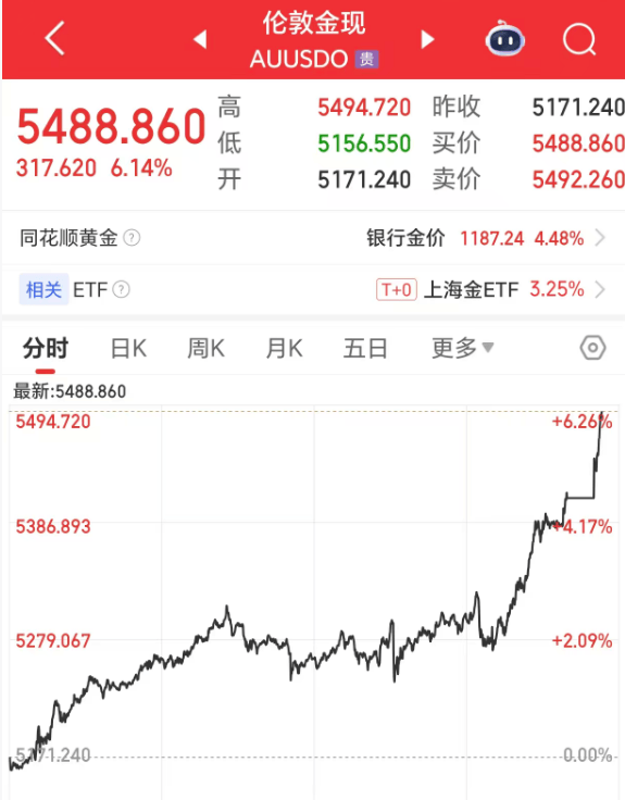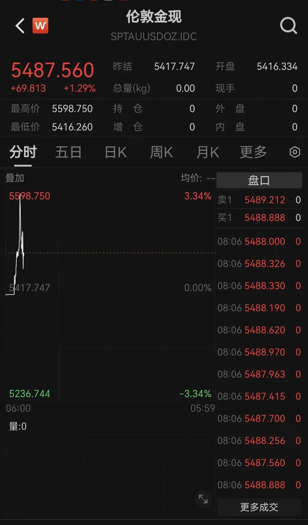现货黄金盘中一度逼近5600美元/盎司大关,但随后快速跳水。截至发稿,跌破5500美元每盎司。现货白银向上触及118美元/盎司,创下历史新高,日内涨1.12%。