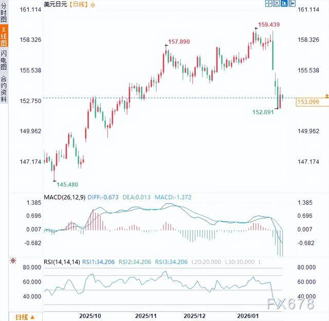 日本国内政策决策进一步加剧了局势。2026年1月14日,美元兑日元一度涨至2024年夏季以来的最高点(159.44),日元此次下跌主要源于市场对首相高市早苗倾向于宽松货币政策的担忧,这可能会扩大日本本已庞大的国家赤字。
