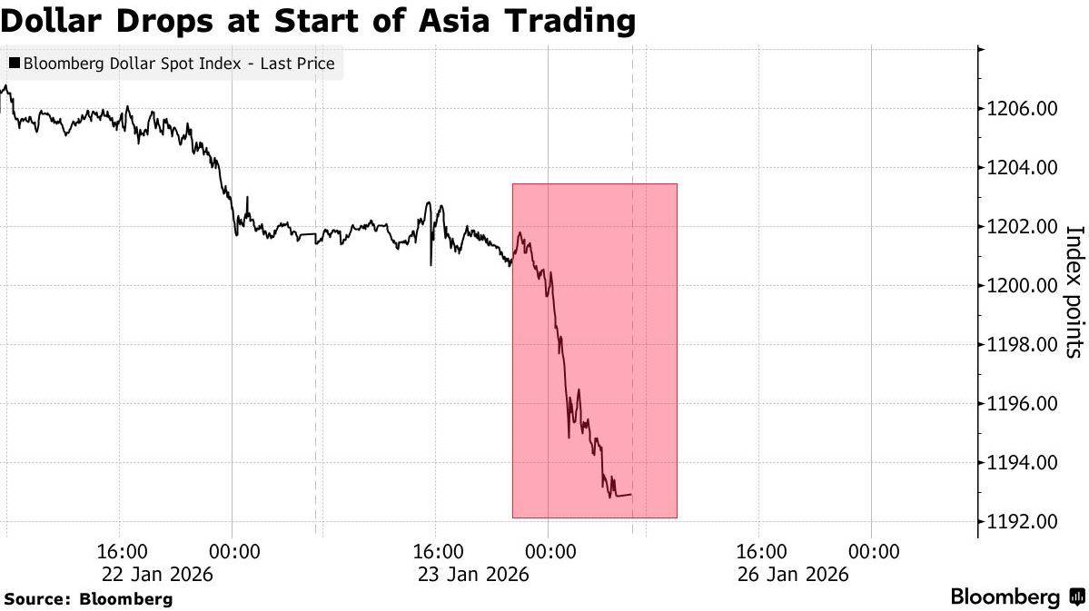 上周美元创下5月以来最差周度表现,此前一周美国政策制定反复令金融市场动荡——特朗普先是威胁对欧洲加征关税以推进其购买格陵兰岛计划,随后突然放弃;上周六又威胁若加拿大与中国达成贸易协议,将对加方加征100%关税。
