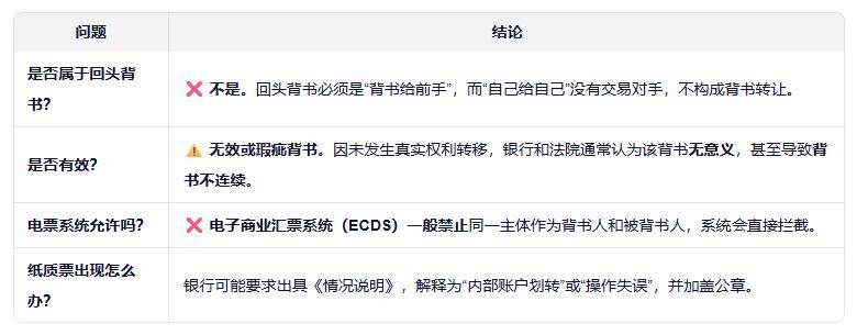 “自己背书给自己”不是回头票,而是无效操作,属于背书瑕疵。回头票是“背给前手”,自己给自己是“没背出去”——两者本质不同。