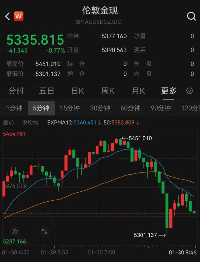 30日早间,现货黄金短线跳水,5分钟跌超50美元,向下逼近5300美元。截至发稿有所回升,报5335.815美元/盎司。