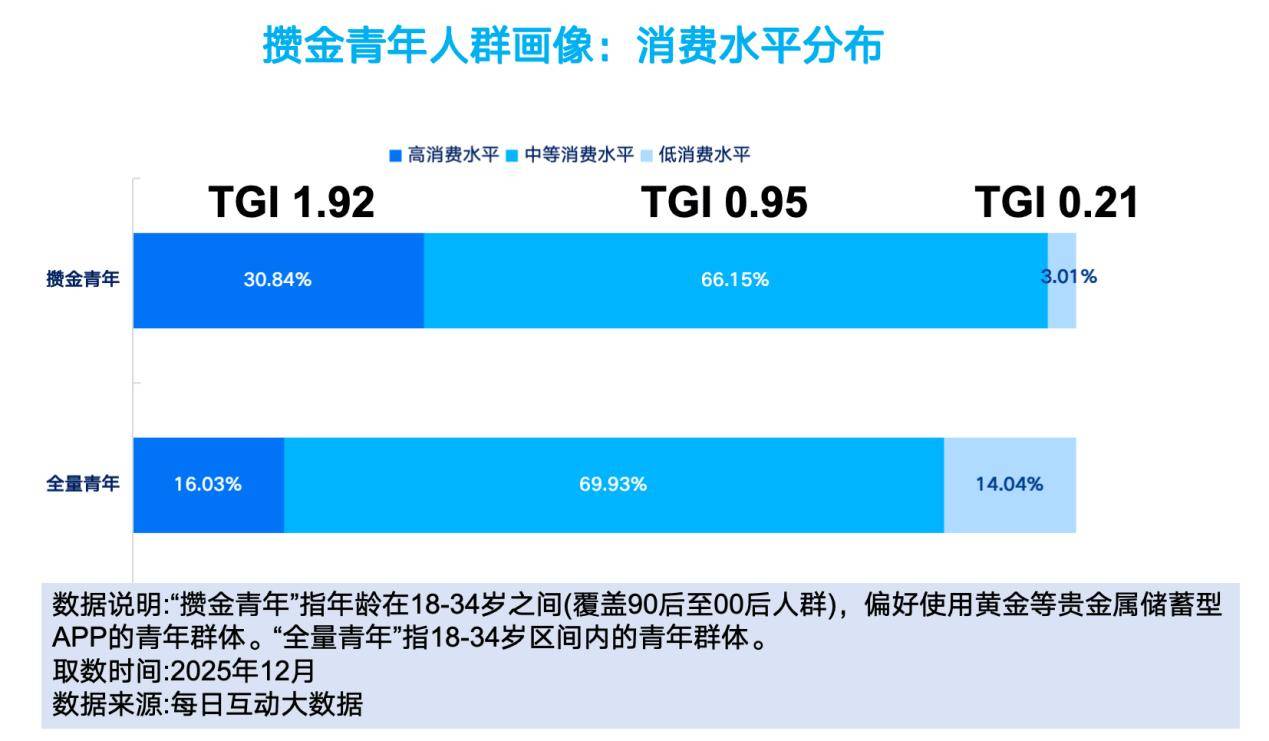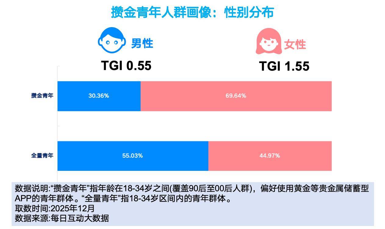 凤凰网科技讯 1月26日,每日互动大数据近日发布了对“攒金青年”(18-34岁偏好使用贵金属储蓄类APP的年轻群体)的用户画像洞察。