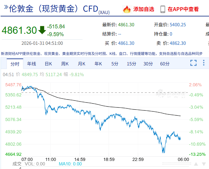 截止4:46,现货白银跌28.95%,从110美元/盎司上方一路跌至81.99美元/盎司,日内跌幅最大时为36.75%!截止4:51,现货黄金跌9.59%,从5400美元/盎司跌至4861.3美元/盎司,日内跌幅最大时为13.22%!