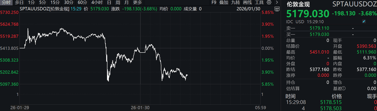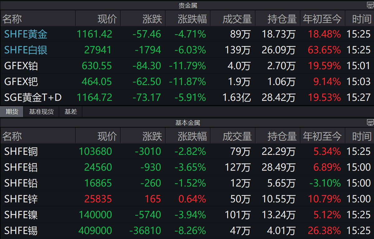 昨夜全球宏观情绪退潮,今天有色板块大跌。现货黄金日内振幅近500美元,亚盘再度逼近5600美元,但仍未能站上整数点位,并在美盘急转直下;随后又上演V形反转,收复超200美元,最终收跌0.85%,报5377.16美元/盎司;现货白银也同步剧烈波动。