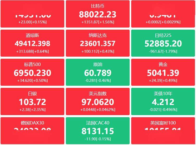 外盘:投资者聚焦企业财报及美联储货币政策决议,美股集体收涨,其道指涨313.69点,涨幅0.64%报49412.40点;纳指涨100.11点,涨幅0.43%报23601.36点;标普500指数涨34.62点,涨幅0.50%报6950.23点;科技股涨跌互现,苹果、甲骨文、Meta涨超2%,英特尔跌超5%,AMD、特斯拉跌超3%;中概股多数下跌,纳斯达克中国金龙指数收跌0.62%,百度跌超3%,小鹏汽车跌超2%,阿里巴巴跌超1%,理想汽车涨超1%。