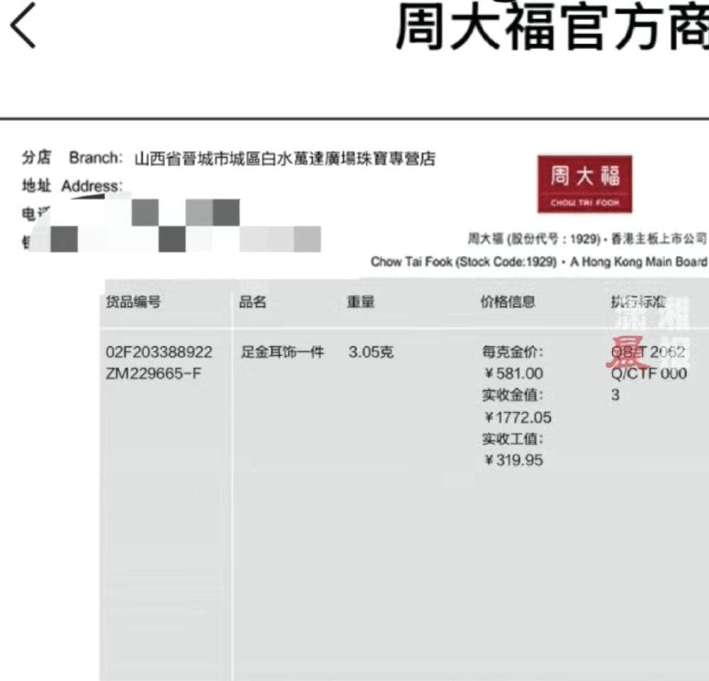 1月31日凌晨,孙女士向潇湘晨报记者介绍称,她已来到深圳四天,仍未能按计划从线下渠道兑付黄金。1月30日,她发现自己随身佩戴的金耳饰也意外丢失了。根据孙女士提供的票据信息,该足金耳饰重3.05克,按周大福1月30日金饰价格来算,其价值已超过5000元。