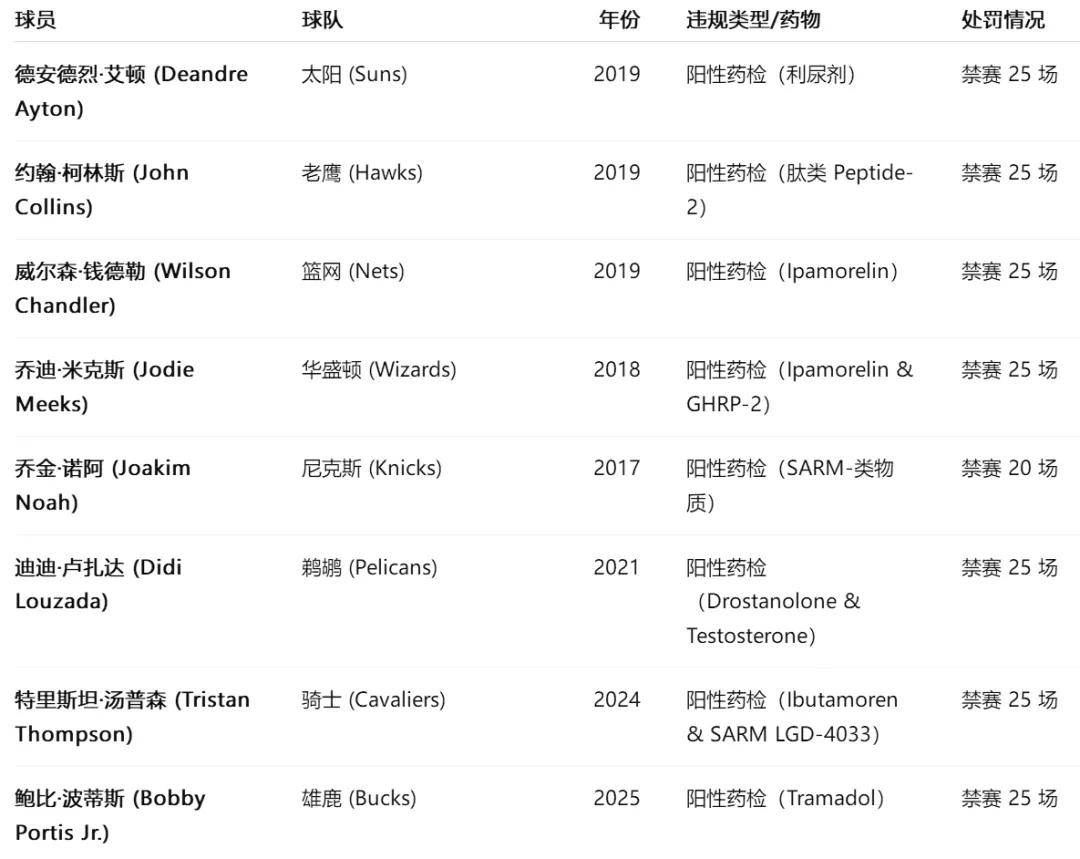 违反联盟禁药条例的处罚比较重,一般要禁赛20场以上。2025年2月21日,雄鹿内线波蒂斯被禁赛25场。再往前看,2024年1月24日,特里斯坦-汤普森被禁赛25场。光是2019年,艾顿、约翰-科林斯、威尔森-钱德勒等全被禁赛25场。