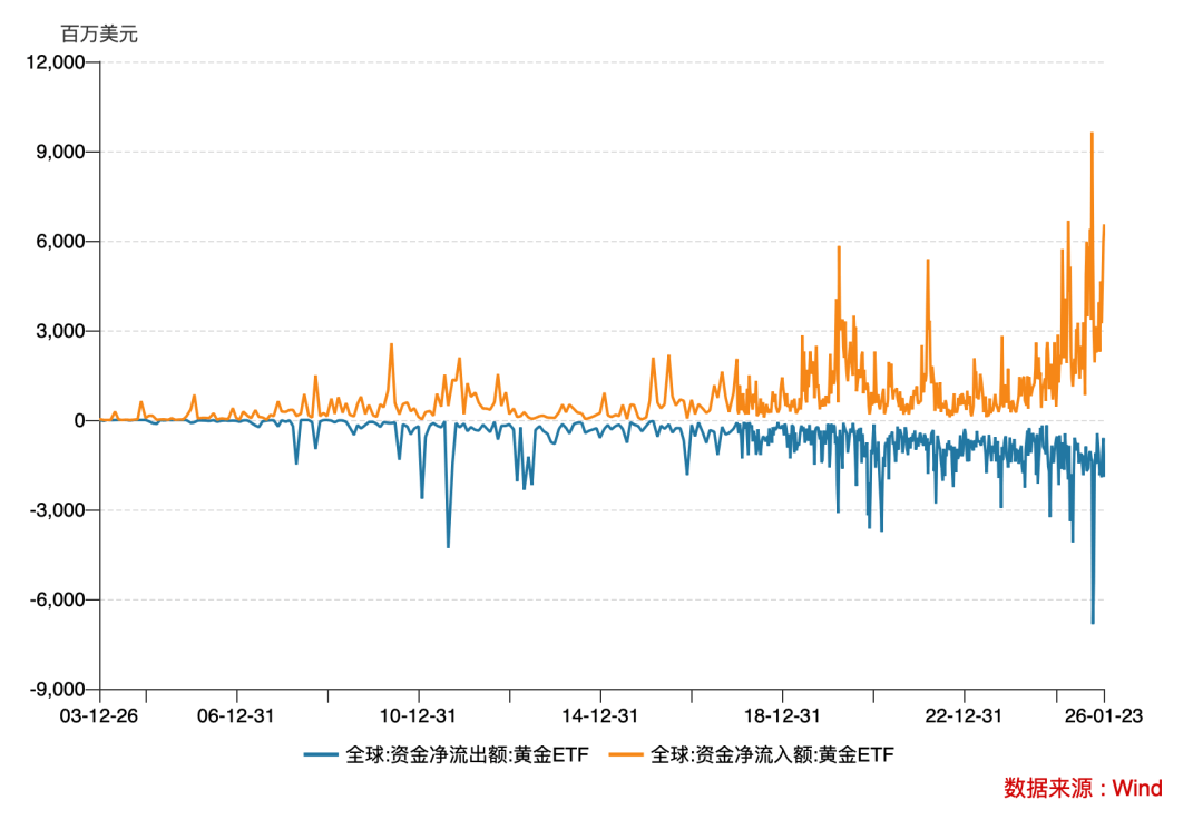 从相关数据来看,美国黄金ETF波动率指数当前已仅次于2020年疫情初期时水平。回顾历史,美国金融危机时期,黄金ETF波动率超过60%,而昨日该波动率已达到44.08%,与2020年疫情初期48%的高位十分接近,显示当前市场波动幅度相当之大。2026年1月最后一周的全球黄金ETF资金净流入额超过65.5亿美元,而净流出额只有19.1亿美元,净流入是净流出的三倍以上,净流入额也基本上是本世纪以来的次新高。“这表明机构投资者的长期信心尚未完全动摇。长期来看,黄金的三阶段牛市格局并未改变,预计后续还会有所表现。” 刘英说。