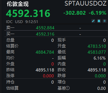 【大河财立方消息】2月2日上午,现货黄金跌大跌继续,跌幅超过6%,失守4600美元关口,报4592.316美元/盎司。