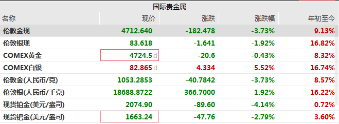 目前,伦敦金现跌超3.73%,报4712.64美元/盎司,盘中一度失守4600美元;伦敦银现跌1.92%,报83.618美元/盎司。