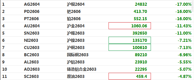 国内贵金属期货开盘普跌,沪银期货主力合约跌停,铂、钯逼近跌停,沪金跌近11%。截至发稿,沪银、铂、钯仍跌停,沪金跌11.43%。