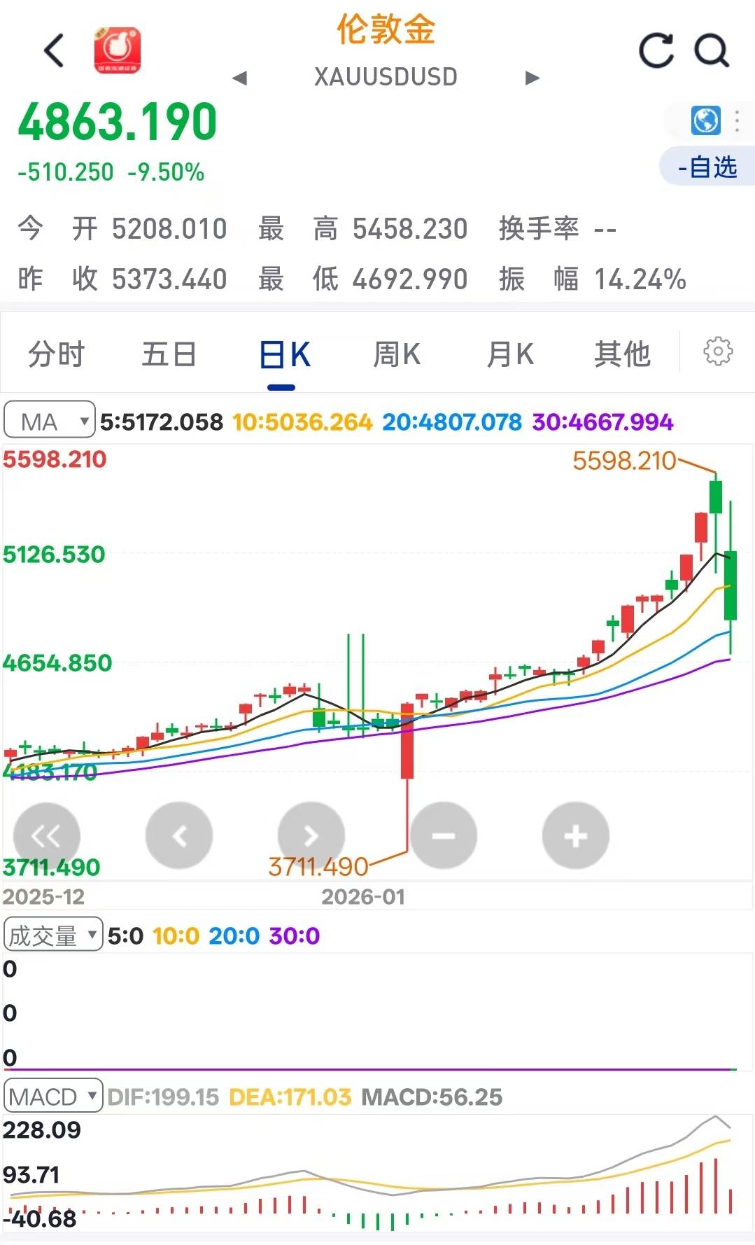 行情在短短数日内上演了惊人的反转。就在2026年1月29日,伦敦金现货还一度触及每盎司约5595美元的历史高位,当月累计涨幅逼近30%。然而,狂欢在次日戛然而止——1月30日,国际金价单日暴跌超过9%,创下逾40年来最大单日跌幅;白银的抛售更为骇人,价格断崖式下跌31.37%,刷新了1980年3月以来的纪录。