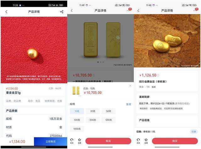 不过,第一财经午间登录招商银行APP,发现小克重黄金中的1克重招行金攒金豆和3克重招行金瓜子均有库存。招行金投资金条从10克至1000克也均处于可购买状态。