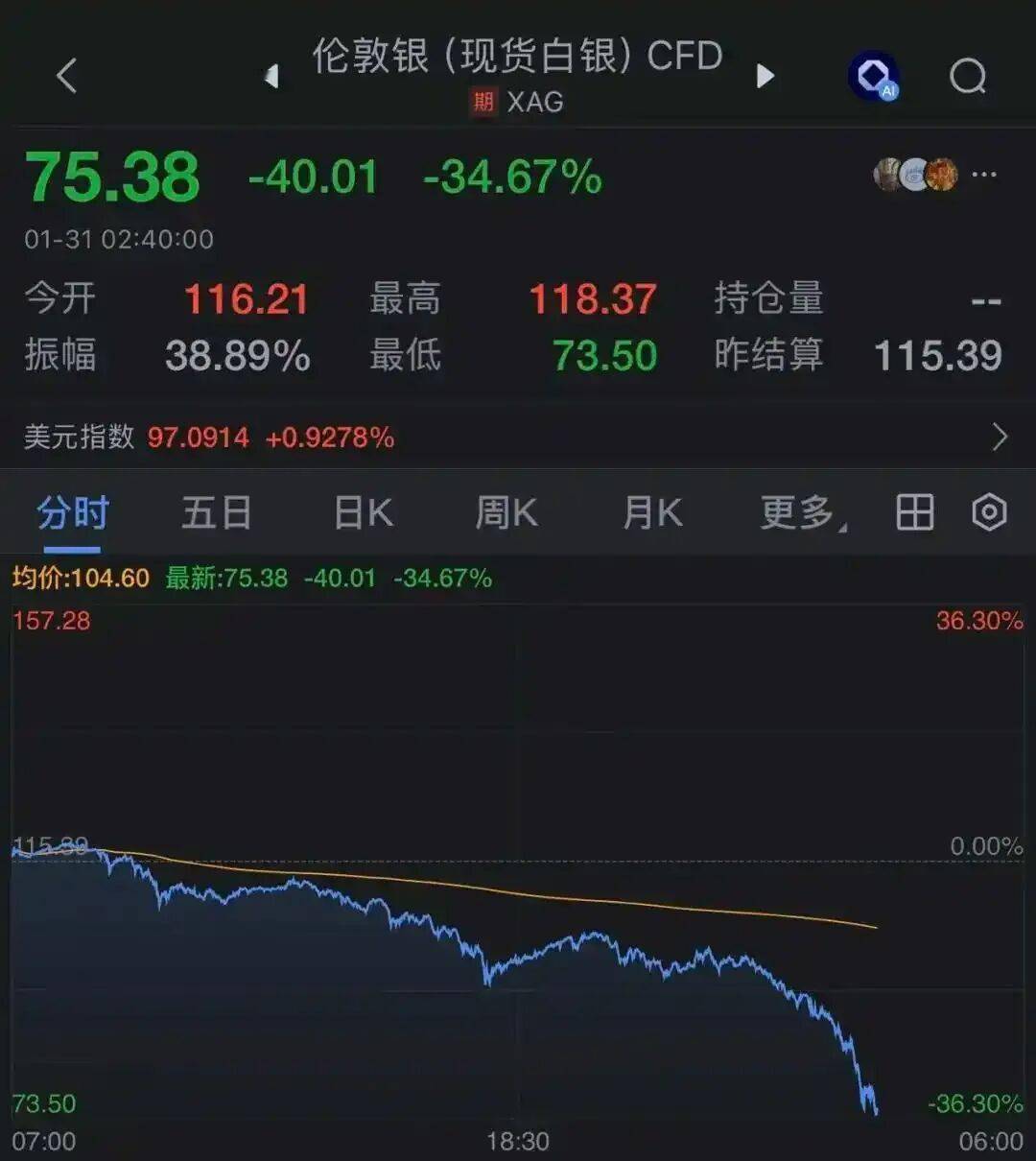 现货白银盘中一度暴跌36%,收跌26.9%,报84.7美元/盎司;现货铂金重挫17.59%;现货钯金重挫14.89%。