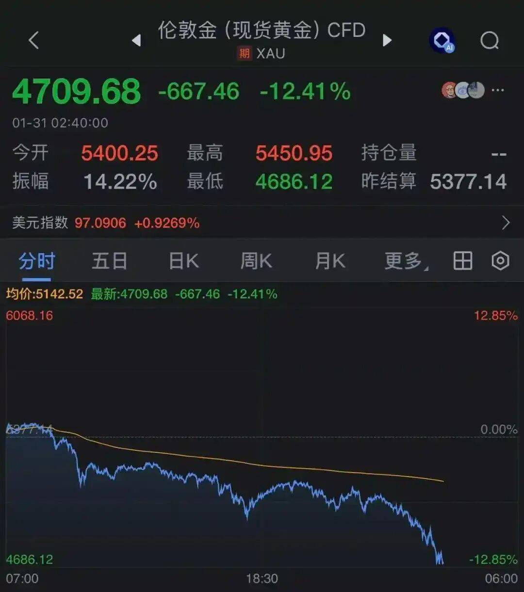 北京时间1月31日凌晨,恐慌性抛售席卷全球贵金属市场。 现货黄金价格失守5000美元大关,最终收跌9.52%,报4865美元/盎司,盘中最高跌超12%。