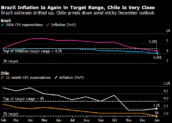 本周拉美地区经济数据较为清淡,巴西和智利央行将率先发布报告。巴西央行最新一期《焦点调查》显示,市场对 2026 年通胀率的预期小幅上调;而智利的通胀预期则温和下行,且与该国央行的通胀目标逐步靠拢。