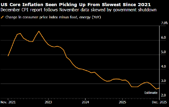 经济学家预计,12 月整体物价与核心物价环比涨幅均为 0.3%。美国劳工统计局此前发布的 CPI 报告因美国史上最长政府停摆而延迟,且未能公布环比变化数据。