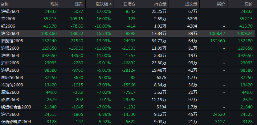 2月2日,除了上周末大跌的黄金、白银以外,铜、铝、锌等基本金属与原油、燃料油等品种也出现大幅下跌。截至当日收盘,沪金2604合约大跌15.73%,沪银、铂、钯、铜、铝等多达12个商品期货出现跌停。
