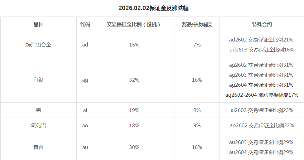 同日,招商银行发布通告,自2026年2月2日(星期一)收盘清算时起,Au(T+D)、mAu(T+D)、Au(T+N1)、Au(T+N2)、NYAuTN06、NYAuTN12等合约的保证金比例从60%调整为70%,涨跌幅度限制保持15%不变。