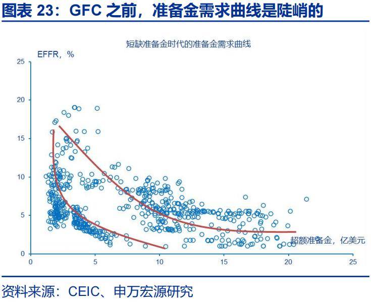 充足准备金是相对于需求而言的,是动态而非静态的。美联储从未事前明确缩表的终点,很大程度上是因为准备金需求是不确定的。达拉斯联储主席、前SOMA总经理洛根(Logan)曾说,“从长远来看,我们真的不知道需要多少准备金才能形成有效的地板和走廊,答案主要取决于准备金需求曲线的形状。”16但可以确定的是,由于补充杠杆率(SLR)等监管加强了对“高质量流动性资产”(HQLA)的需求,后危机时代的准备金需求曲线大幅右移且更加扁平化了。前者表明在任何利率水平上银行对准备金的需求都增加了,后者表明准备金需求的利率弹性下降了——同等幅度的准备金供给的变化引起的利率变化幅度下降了。