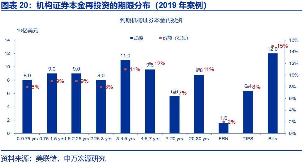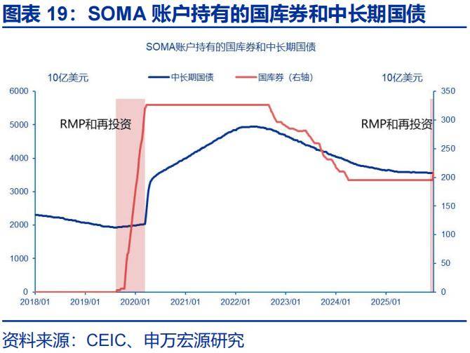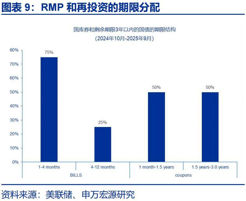 所以,2019年10月中旬之后,RMP和再投资也是同步推进的9,与2025年12月之后的情形类似。2019年8月美联储启动再投资计划之后,SOMA持有的国库券和中长期国债开始上行,10月中旬启动RMP之后,SOMA增持国库券的速度明显上行,以满足每月600亿美元的指引——再投资的规模受限于机构证券的到期规模和期限的分布,故只能依赖于RMP购买国库券的方式主动管理准备金。再投资购买的政府证券的期限按流通规模(面值)进行分配,以保持久期中性10。本次RMP的初始规模为400亿美元/月,较2019年少200亿,或因为准备金处于充足区间。与RMP1的一个区别是,RMP2的期限最长可以达到3年。