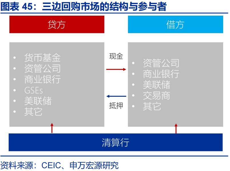商业银行和GSEs也是回购市场的重要参与者。所以,RMP的外溢效应也将通过回购市场进行传导。回购市场是一个有担保的短期融资市场,包括:三边回购市场(tri-party)和双边回购市场(bilateral)22。三边回购市场规模更大,借方(如高信用等级的交易商)以高质量流动性资产为抵押品,向贷方(如MMF、GSEs)借入资金,并允诺在一段时间后以某一价格回购抵押品。在双边回购市场,贷方(如大型交易商)和借方(如小型交易商和对冲基金)直接交易和结算。