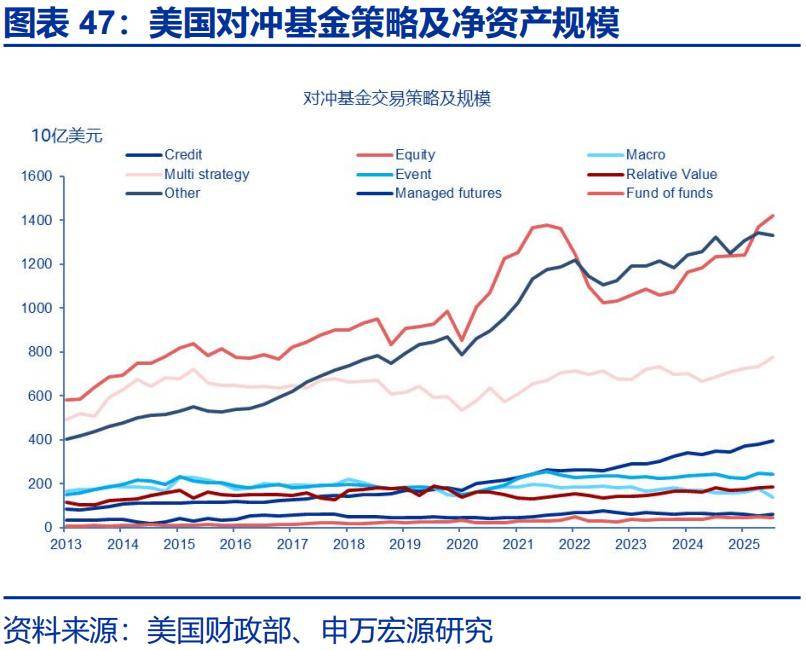 具体到机构层面,以对冲基金(HF)为例。作为双边回购市场的重要借方,HF连接着货币市场与资本市场,是RMP如何影响资产定价的核心媒介。HF的交易行为提升了美股、美债市场的深度,改善了定价效率,但也放大了波动。HF常用的策略包括:股票多空(Long / Short Equity)、国债基差(Basis Trade)与宏观策略(Macro Strategy)。其中,股票策略规模最大,截止到2025年9月底净资产规模为1.4万亿美元,占总规模(4.6万亿)的30.9%,占美股市值的1.9%23。由于主流HF的股票多头仓位多集中在前10大公司,所以在流动性过剩或短缺时,HF股票策略会分别强化股指的上涨与下跌。在流动性过剩时,事件驱动的TACO交易和Buy the Dip策略会加速VIX的收敛,反之则反之。归纳而言,准备金供给或主要影响波动,基本面和无风险利率仍是基础性和方向性影响因素。