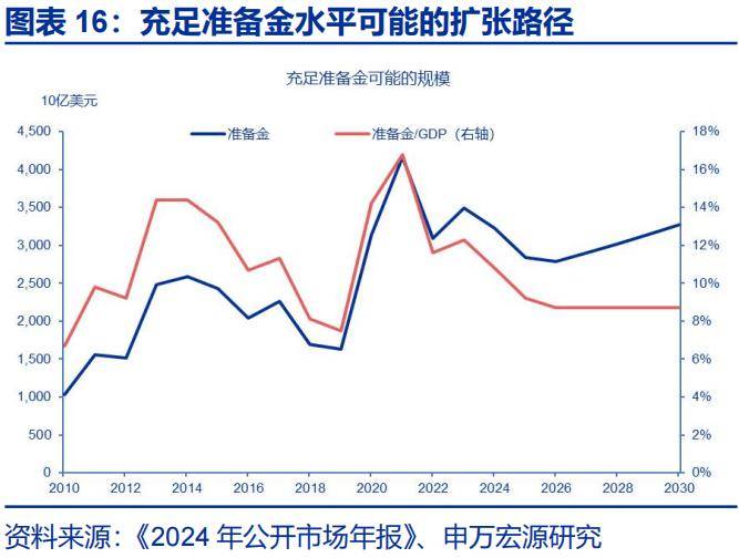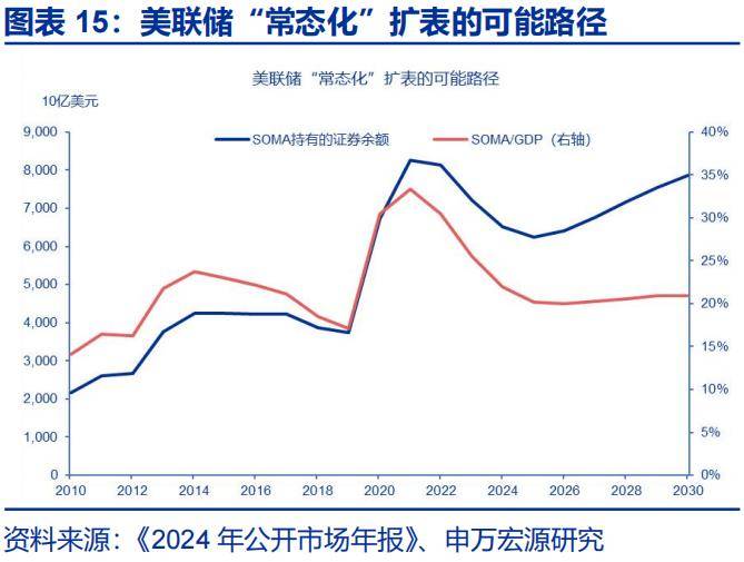 数量回答的是“买多少”问题。RMP的“反应函数”是金融机构的准备金需求+居民的现金需求,叠加国债交割、缴税等季节性因素的扰动。经验上看,准备金需求和现金需求都与名义GDP增速基本一致。所以,中期而言,RMP速度也与名义GDP增速基本一致。假设短期内美国名义GDP增速中枢维持5%,美联储每年或需增持国库券近3,000亿美元(月均250亿6)。实践中还需考虑扰动因素。RMP将遵循“长板原理”,在债券交割或报税截止日之前,SOMA增持国库券的规模或有抬升。纽约联储估计,在一定假设条件下,为维持充足准备金,SOMA持有的证券占GDP的比重约为20%-21%,准备金/GDP约等于8.7%——显然慢于QE式扩表的速度。