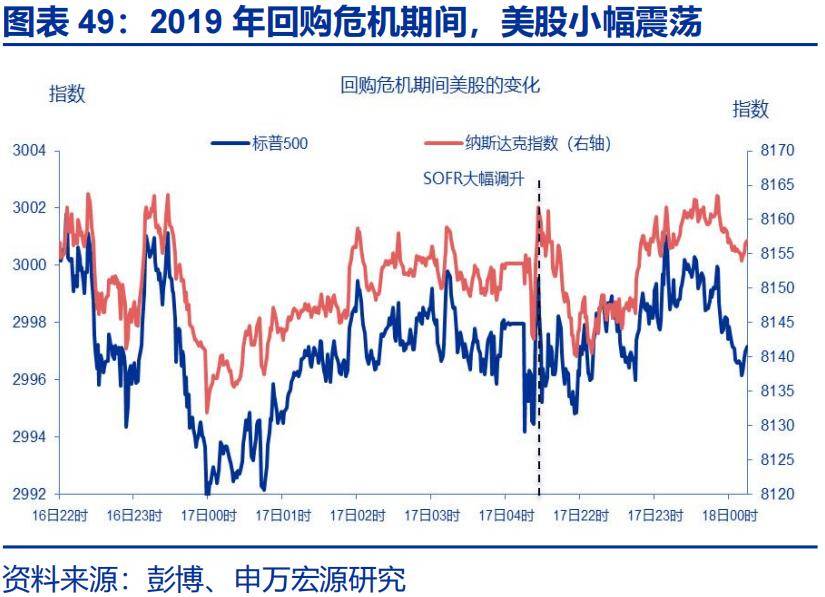 但是,只有当回购市场失灵演变为全市场“钱慌”级别的系统性危机时,才能对资本市场产生实质性冲击。9月17日盘中,SOFR一度暴涨至10%(9月17日均值5.25%,FFR目标区间为2-2.25%)。此后至2019年底,回购市场抵押贷款规模持续下降,10月美联储重启RMP后也未企稳。但是,回购危机对资本市场的外溢效应极为有限。美股和美债利率均表现为小幅震荡,未出现中枢的变化,波动率在出现跳升后也快速收敛。真正需要关注的情形是,某一外生冲击引发了货币市场流动性的“挤兑”,这表明风险偏好或已经降至“冰点”,并有可能进一步加剧风险资产抛售压力。