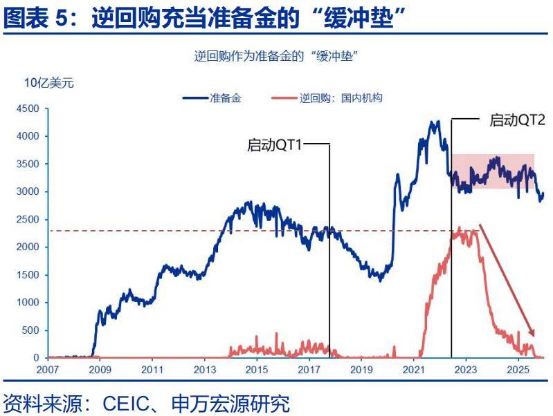 相较而言,QT2缩表规模更大、持续时间更长,但进展却更为顺利,主因逆回购的“缓冲垫”作用、美联储渐进的操作方式及加强了与市场的沟通。第一,QT2早期准备金更加充裕,作为“缓冲垫”的逆回购一度囤积了超过2万亿的美元非银流动性。从QT开始到2025年8月,准备金基本保持在3万亿美元以上波动,主因缩表主要吸收的是逆回购的流动性。第二,QT2采取了更渐进性的举措,于2024年6月和2025年4月放缓了缩减国债的速度3,而QT1直到2019年5月才放缓缩表(缩表结束前4个月,国债上限从300亿降至150亿4,MBS维持200亿)。第三,美联储加强了与市场的沟通,货币市场流动性的监测框架也更加成熟。