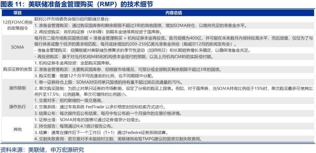 美联储扩表已进入“新常态”阶段,其提供现金和准备金的方式包括:准备金管理购买(RMP)和机构证券本金再投资。12月FOMC例会指示交易台从12月12日开始实施RMP,首月规模为400亿美元(再投资+净购买),预计2026年4月之前保持高位,此后速度可能放缓。在发布会的问答环节,鲍威尔估计,为了与银行体系或经济增速相匹配,仅此一项就要求每月增加约200-250亿美元——实际扩表的下限。期限主要为1年以内的国库券(75%为1-4个月,25%为4-12个月),根据需要可部分或全部购买剩余期限3年以内的国债,具体情况根据过往12个月的流通量(面值)动态分配。2025年12月,SOMA增持了约380亿美元国库券。
