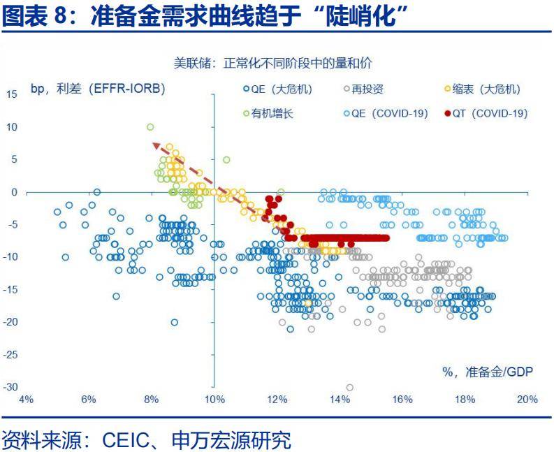 基于两次QT的经验,为维持充足准备金供给,结合纽约联储的估算,SOMA持有的证券占GDP的比重约为20%-21%,准备金占GDP的比重8.7%左右,准备金占银行总资产的比重11-12%17。参考QT1的经验,准备金/GDP跌至8%以下或可能进入短缺区间,7%以下则可能出现流动性冲击。
