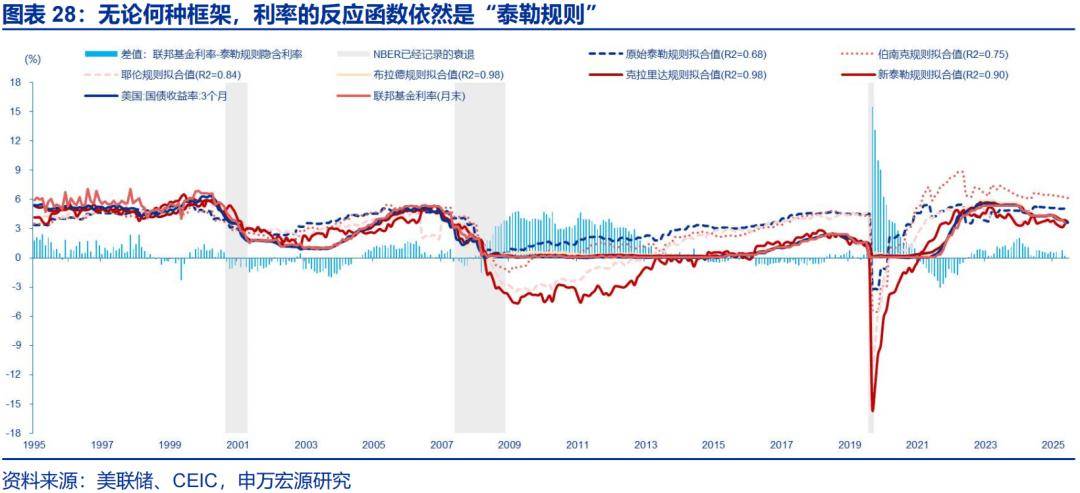 无论何种框架,政策利率才是货币政策松紧程度的“风向标”,而非准备金数量。在充足准备金框架下,政策利率和准备金数量“脱嵌”,分属两套决策体系。政策利率仍适用于“泰勒规则”框架,美联储需在“双重使命”(最大就业和物价稳定)之间取得平衡。
