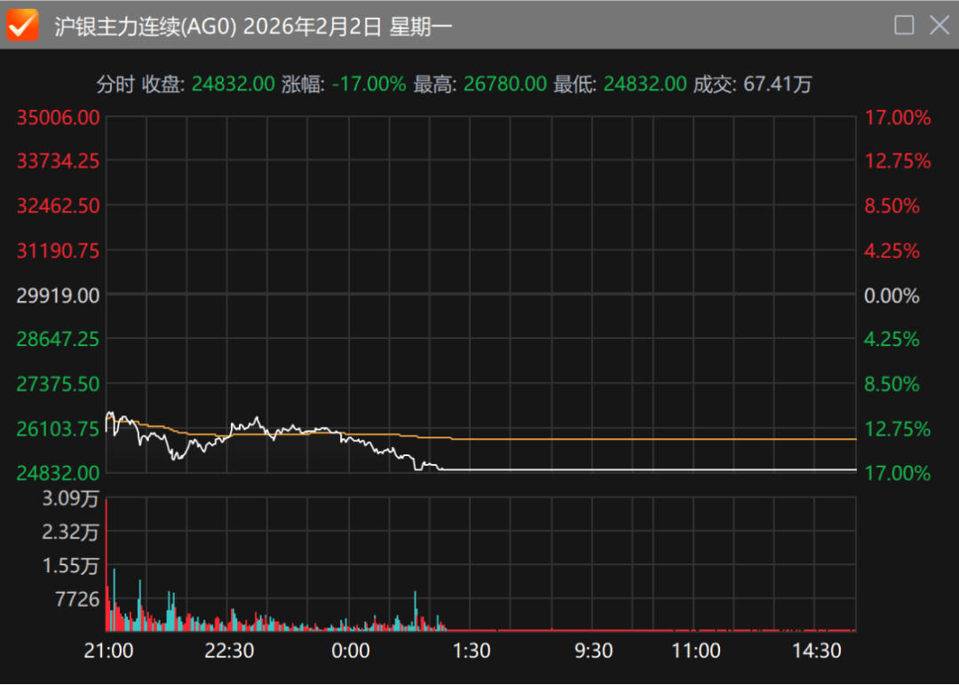 1月31日凌晨,国际白银市场突发崩盘,现货白银盘中一度暴跌36%,尽管此后略有回升,但最终收盘跌幅仍超过25%。