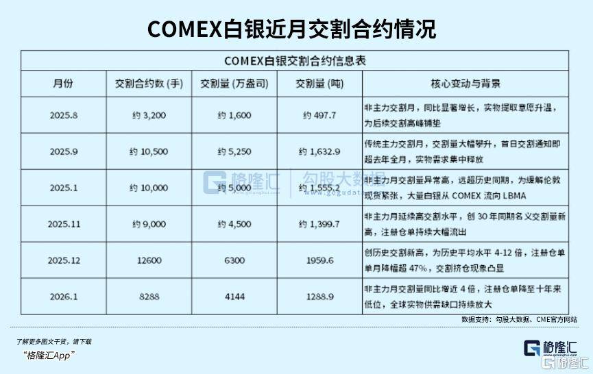 而在过去几个月,COMEX白银交割量持续突破历史极值:10月非主力月交割1555.2吨,同比激增10倍;12月主力月交割1959.6吨(6300万盎司)创纪录;2026年1月淡季仍交割1288.9吨(4144万盎司),同比暴涨300%。
