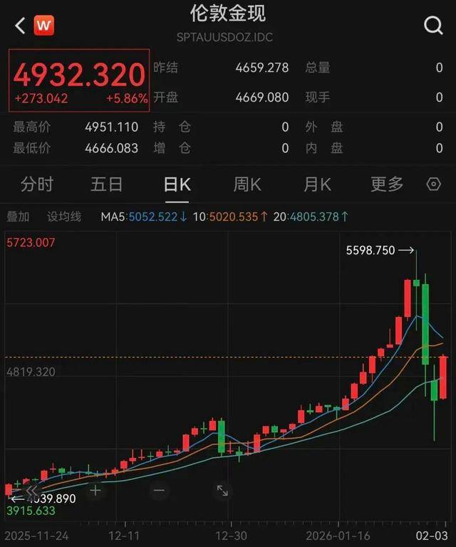 现货黄金向上触及4951美元/盎司,日内上涨6.26%,完全收复昨日的跌幅。