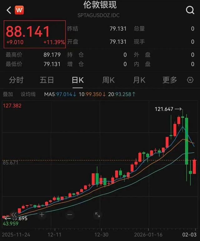 北京时间2月3日晚间,连续3日下跌后,国际金银价格迎来大幅反弹。现货白银盘中大涨超12%,一度触及89.17美元/盎司,完全收复昨日的跌幅。