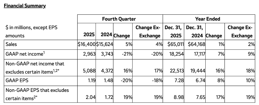 2月3日,默沙东发布2025年第四季度及全年财务业绩。在Keytruda持续增长、Winrevair与Capvaxive等新产品贡献提升,以及动物保健业务表现稳健的推动下,公司全年销售额达650亿美元,同比增长1%。非GAAP口径下每股收益为8.98美元,同比增长17%。