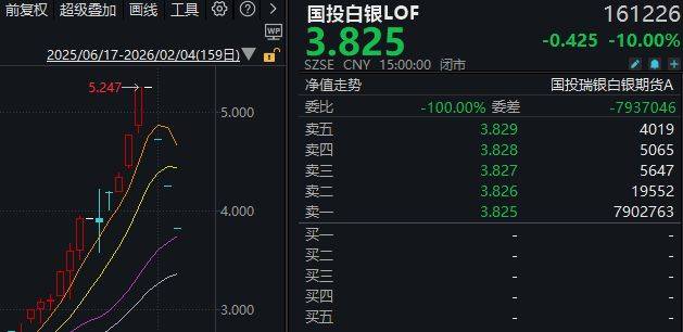 白天交易时段,该产品已录得连续3个一字跌停,最新场内价格为3.825元;截至收盘,有30.2亿元的卖单封住跌停。