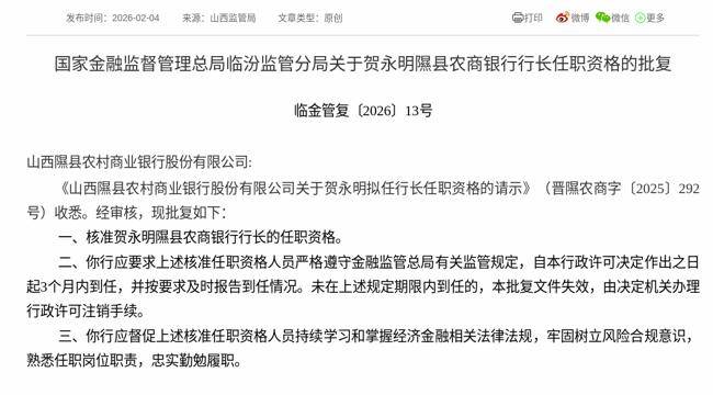 2026年2月4日,根据国家金融监督管理总局消息,《山西隰县农村商业银行股份有限公司关于贺永明拟任行长任职资格的请示》获得通过,批复贺永明山西隰县农村商业银行股份有限公司行长的任职资格。