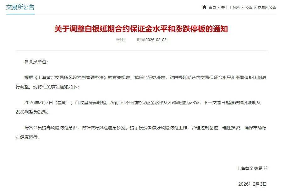 2月3日,上海黄金交易所(简称“上金所”)发布《关于调整白银延期合约保证金水平和涨跌停板的通知》,2026年2月3日(星期二)自收盘清算时起,Ag(T+D)合约的保证金水平从26%调整为23%,下一交易日起涨跌幅度限制从25%调整为22%。