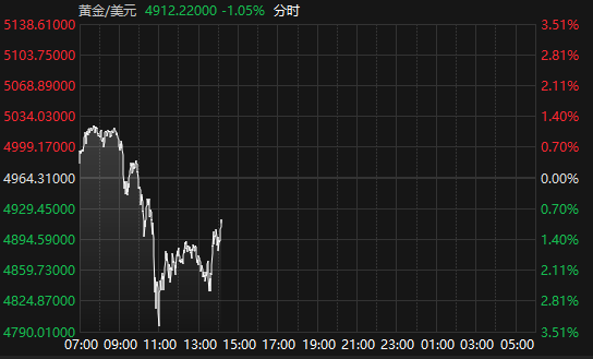 上证报中国证券网讯 据Choice数据,2月5日,国际现货黄金、白银午后跌幅收窄,截至14:11现货黄金报4912.22美元/盎司,日内跌1.05%;现货白银报78.46美元/盎司,日内跌11.04%。
