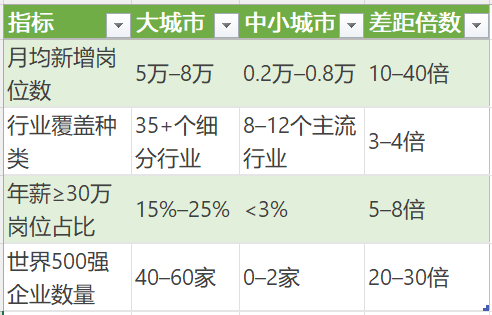大公司总部、高薪行业(金融、科技、互联网、专业服务等)通常集中在大城市,起薪和长期薪资天花板通常远高于小城市。