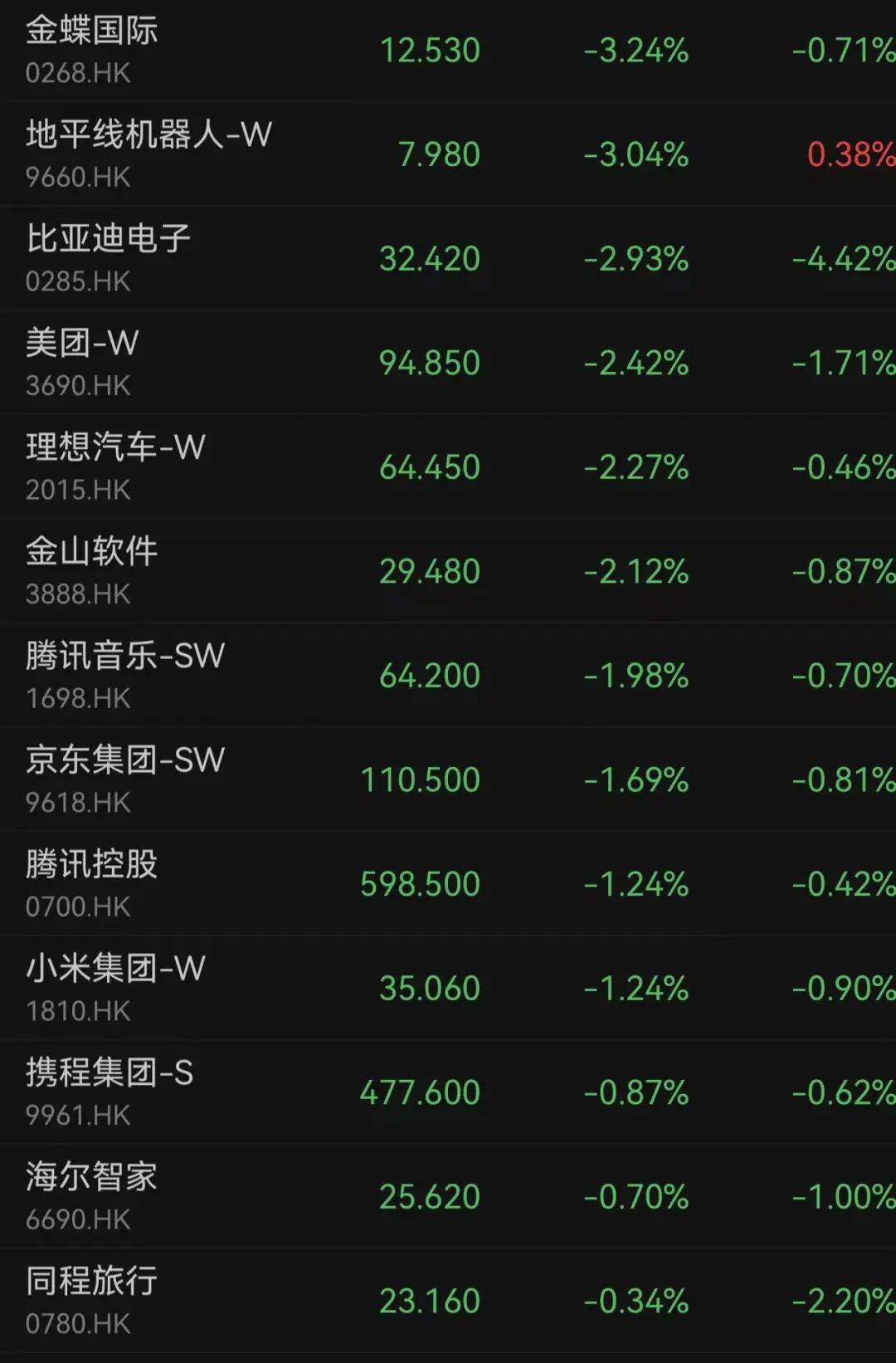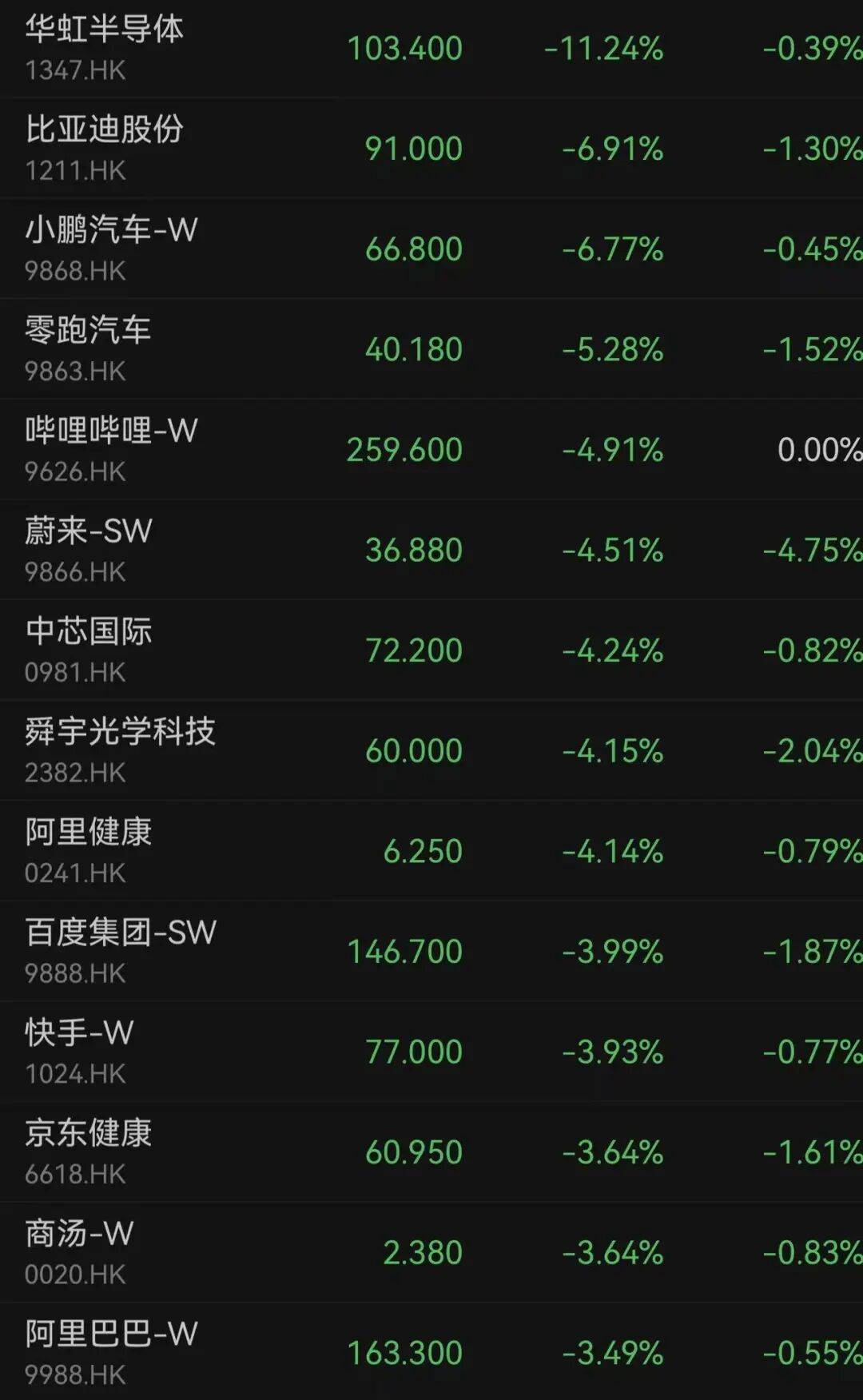 科网股集体下跌,华虹半导体跌超11%,比亚迪股份跌超6%,小鹏汽车跌超6.77%,零跑汽车跌超5%,哔哩哔哩跌超4.9%,快手、阿里巴巴、百度集团跌逾3%,小米集团、美团均走低。