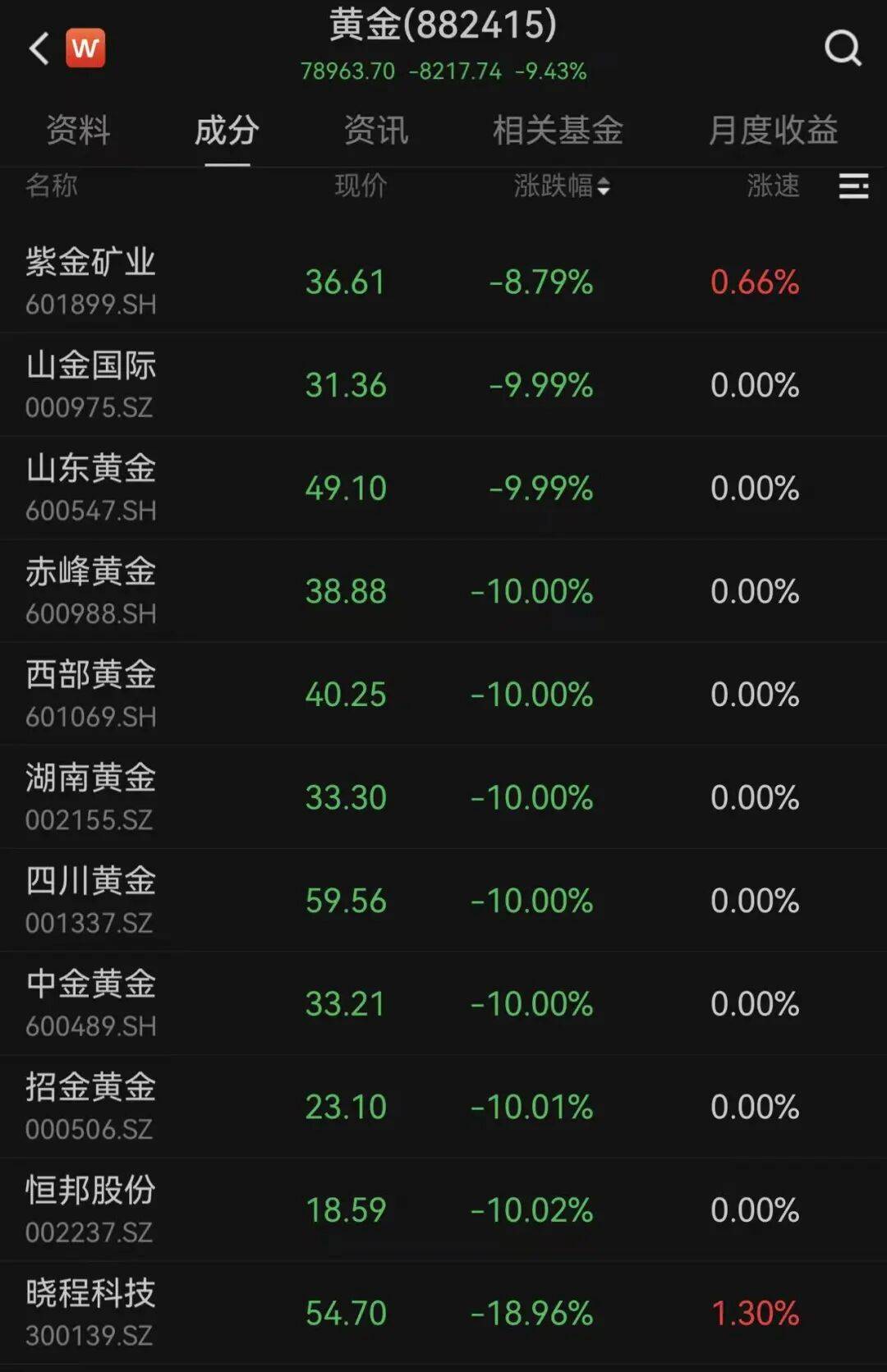 现货黄金、白银日内大跌,贵金属板块遭重挫,山东黄金、赤峰黄金跌超12%,灵宝黄金跌超8%,中国白银集团跌超8%。